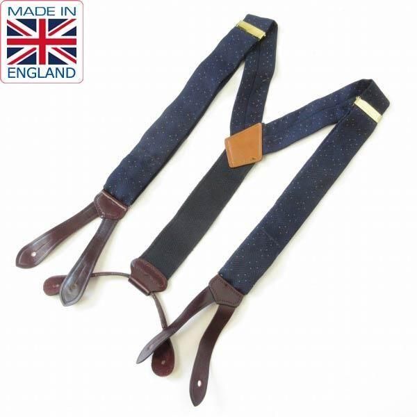 新品 英国製 水玉 織柄×レザー ボタンタブ式 Y型 サスペンダー 紺系 ドット ブレイシーズ ビジネス デッドストック D152
