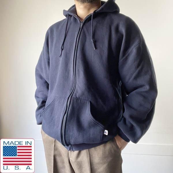 90s USA製 ラッセル 無地 フルジップ スウェット パーカー XL 紺系 トリコ刺繍タグ ブランク ジップ フーディ ビンテージ D152