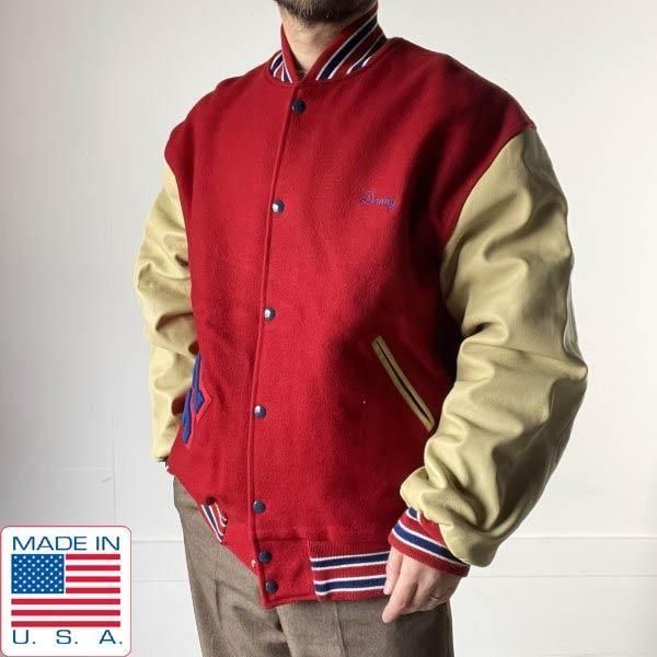 90s USA製 Gem West Aurora ウール×袖レザー スタジャン XL 赤×ベージュ系 アメリカ製 ビンテージ D152