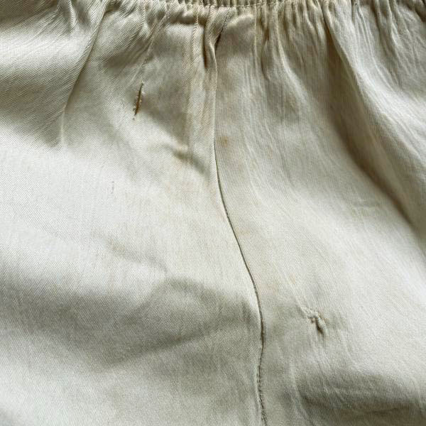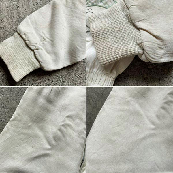 生地広域にまだらなシミ汚れ、股下部分や袖、脇、ヒップ周りなどに穴を塞いだリペア、ヒップに穴があります。