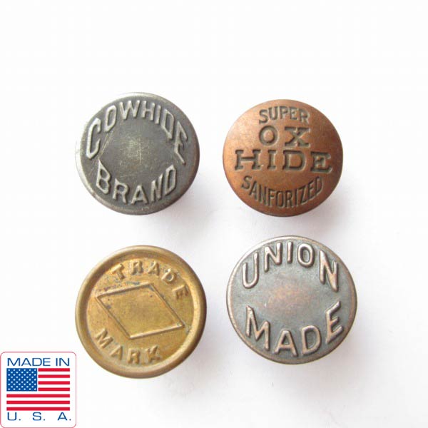 USA製 ビンテージ メタル ボタン 4点セット 30s SUPER OX HIDE,COW HIDE BRAND,TRADE MARK,UNION MADE リペア リメイク D128