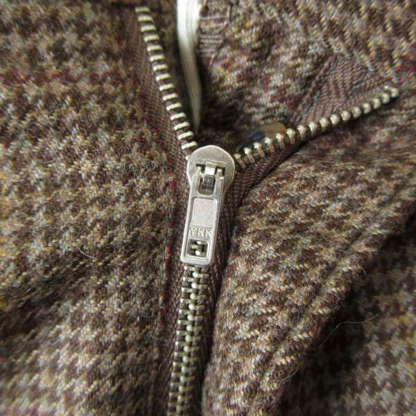 千鳥格子(ハウンドトゥース)柄ベースに淡くストライプラインが入ったデザイン。YKKのピンロックジップ。裾はダブル仕上げです。