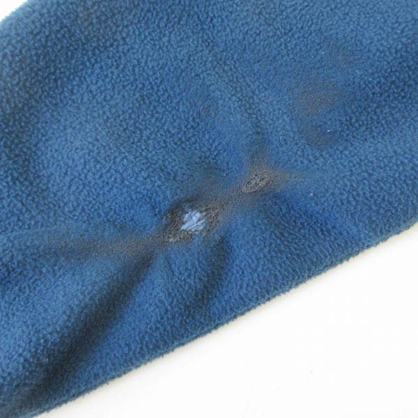 右袖に溶けたような部分がリペアされた箇所があります。肘周りに多少潰れ。袖先・裾パイピングに荒れがあります。