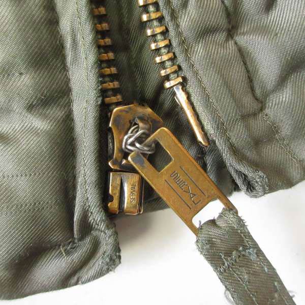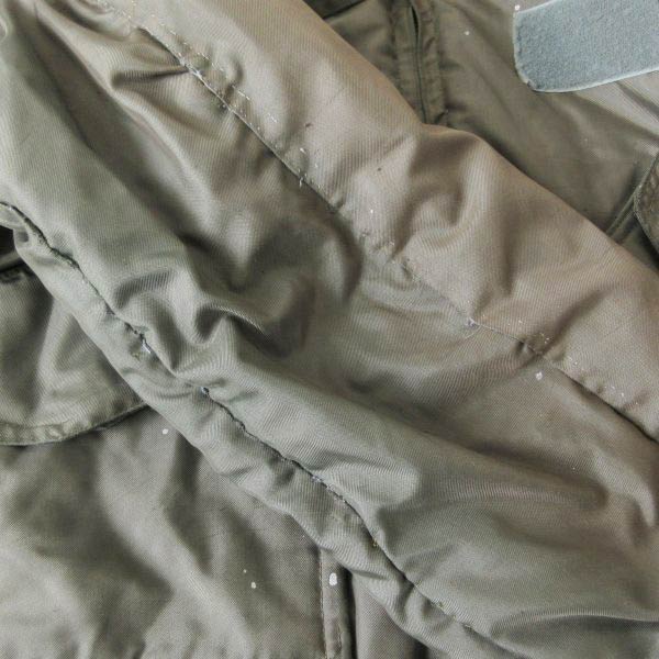 メインジップのヘッドが針金で繋がれた状態です。ペンキの付着や傷、肩や袖周り広域にステッチ抜けやリペアが施されています。
