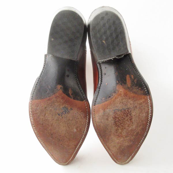 レザーに多少の擦れ、ヒールの土踏まず側のカバーのような素材が左足はほぼ欠損し、右足は縁がめくれていますが着用に支障はありません。