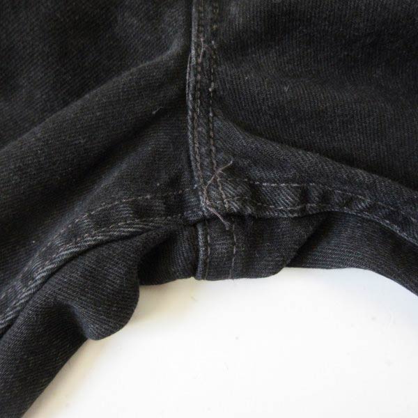 古いジーンズで見られる股下インシームの擦り切れはありません。