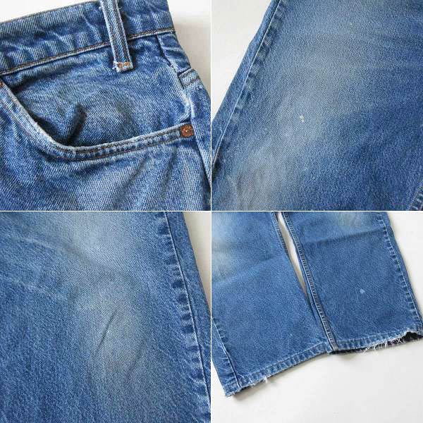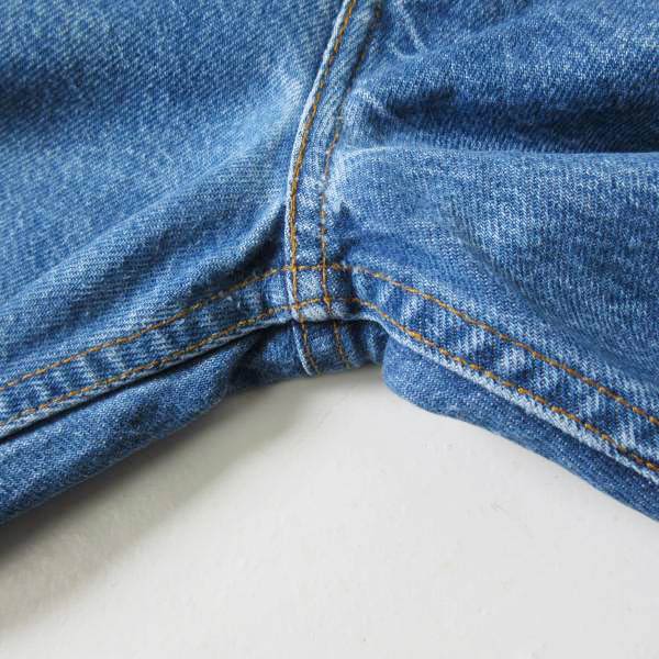 古いジーンズに見られる股下の擦り切れはありません。裾上げされています。