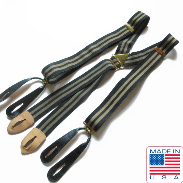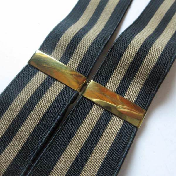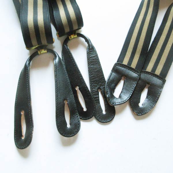 50s USA製 PIONEER 伸縮素材×レザー ボタンタブ式 Xバック サスペンダー 黒×ゴールド系 X型 アメリカ製 ビンテージ D153