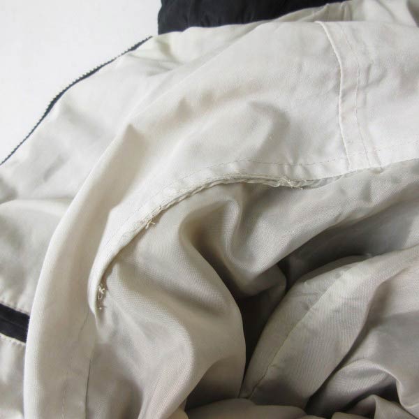 襟元に薄汚れ、袖に生産時に縫い直されたと思われるステッチ跡。右肩内部のライニング生地にリペアがあります。