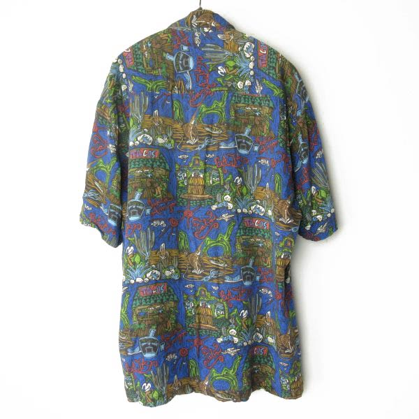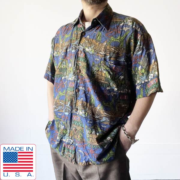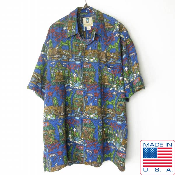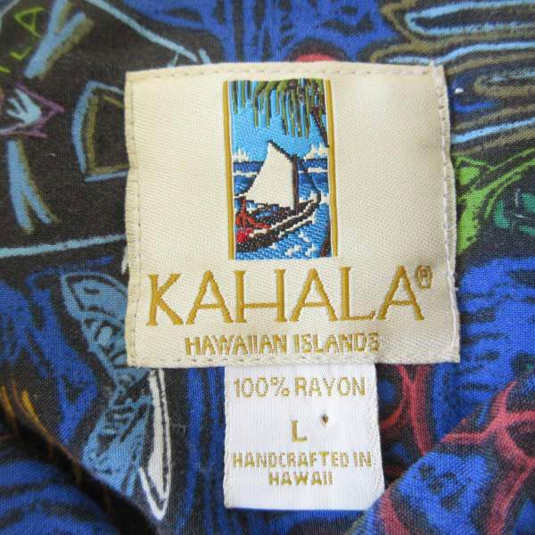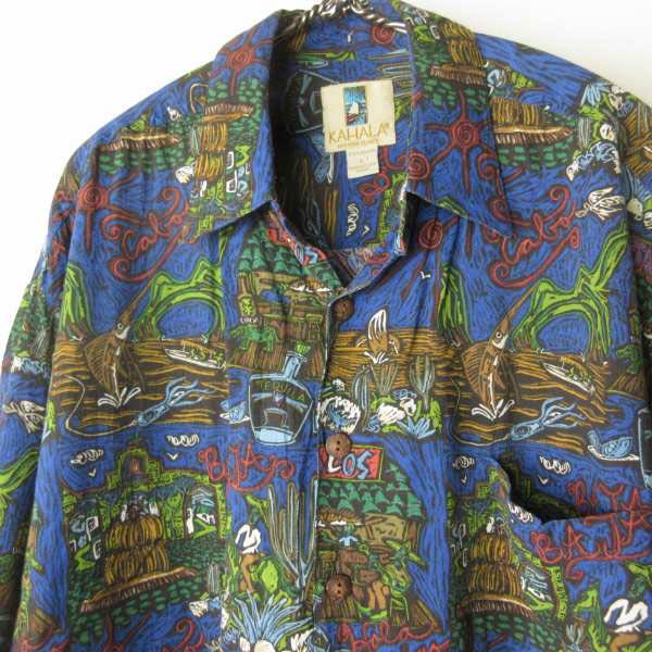 美品 USA製 KAHALA レーヨン 総柄 半袖 アロハ シャツ XL程度 青系ベース ハワイアン 大きいサイズ アメリカ製 D153